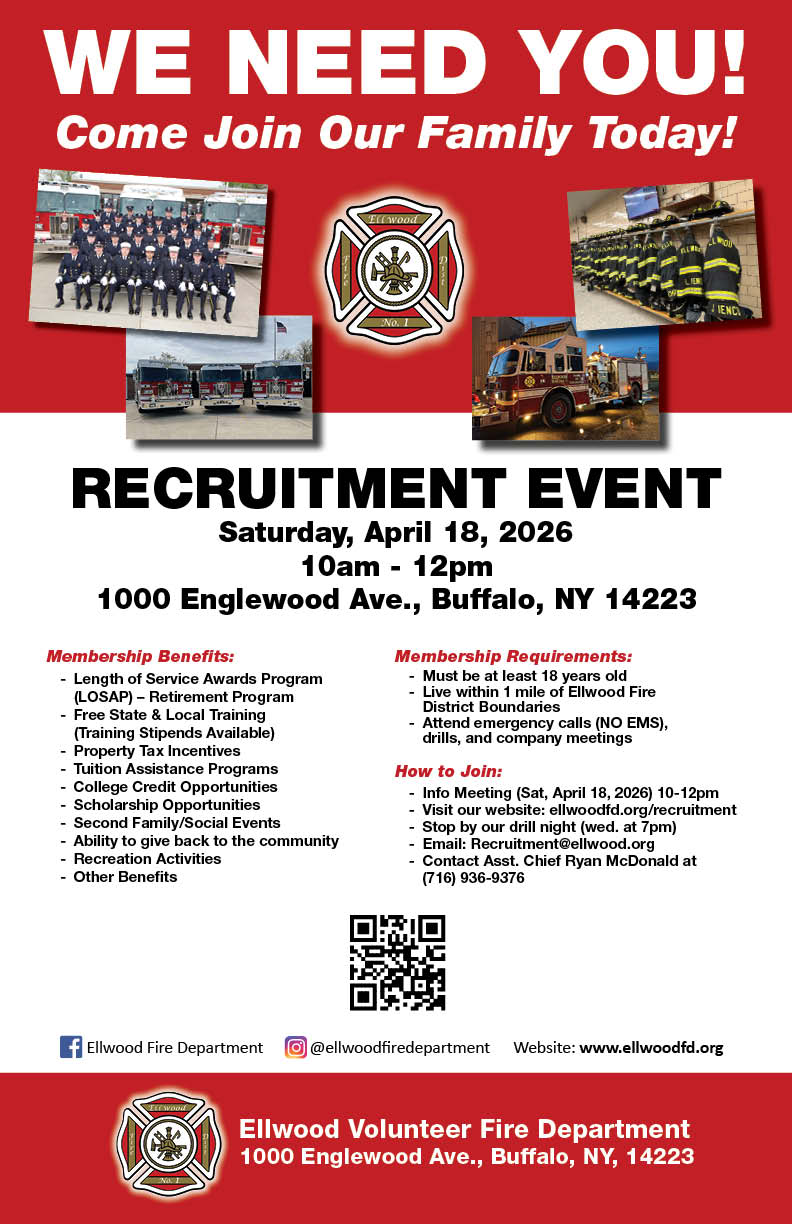 If interested in joining the ranks of the Ellwood Fire Department please contact us by email at recruitment@ellwoodfd.org, call Chief Ryan McDonald at 716-936-9376 or stop by during a Wednesday night drill to talk to us at 7pm.